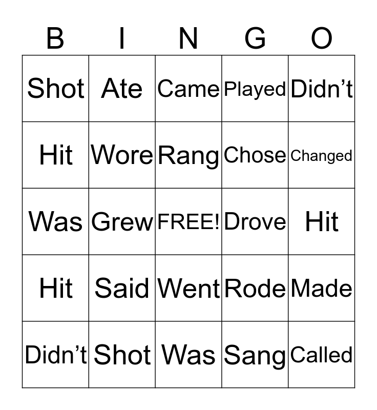 This bingo card has a free space and 25 words: Said, Was, Rang, Didn’t, Didn’t, Shot, Hit, Ate, Drove, Went, Chose, Was, Rode, Made, Wore, Shot, Hit, Came, Changed, Grew, Called, Shot, Hit, Played and Sang.