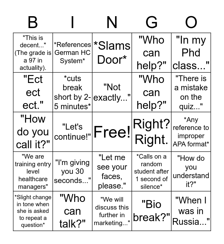 This bingo card has a free space and 24 words: "I'm giving you 30 seconds...", "Who can talk?", "Not exactly...", *Slight change in tone when she is asked to repeat a question*, "In my Phd class...", "This is decent..." (The grade is a 97 in actuality)., "Ect ect ect.", *References German HC System*, Right?Right., "Let me see your faces, please.", "Who can help?", "How do you call it?", *Calls on a random student after 1 second of silence*, "How do you understand it?", *cuts break short by 2-5 minutes*, "Bio break?", *Any reference to improper APA format*, *Slams Door*, "There is a mistake on the quiz...", "Let's continue!", "When I was in Russia...", "We are training entry level healthcare managers", "Who can help?" and "We will discuss this further in marketing...".