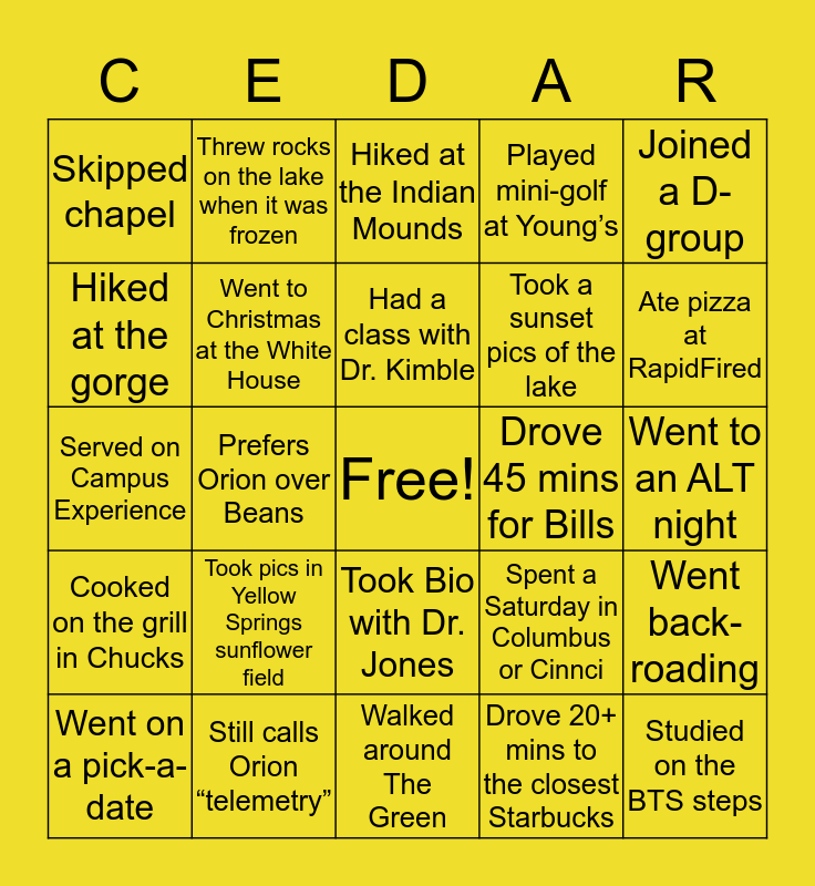 This bingo card has a free space and 24 words: Took pics in Yellow Springs sunflower field, Still calls Orion “telemetry”, Had a class with Dr. Kimble, Went on a pick-a-date, Joined a D-group, Skipped chapel, Hiked at the gorge, Threw rocks on the lake when it was frozen, Drove 45 mins for Bills, Took Bio with Dr. Jones, Took a sunset pics of the lake, Served on Campus Experience, Spent a Saturday in Columbus or Cinnci, Went back-roading, Went to Christmas at the White House, Drove 20+ mins to the closest Starbucks, Went to an ALT night, Hiked at the Indian Mounds, Ate pizza at RapidFired, Prefers Orion over Beans, Studied on the BTS steps, Cooked on the grill in Chucks, Played mini-golf at Young’s and Walked around The Green.