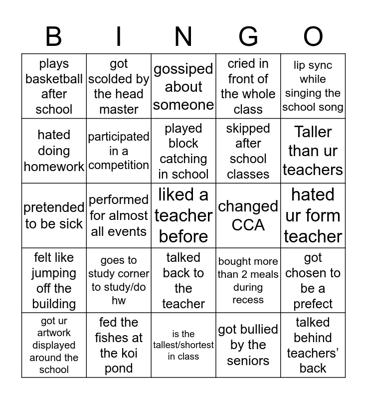 This bingo card has a free space and 24 words: goes to study corner to study/do hw, fed the fishes at the koi pond, played block catching in school, got ur artwork displayed around the school, lip sync while singing the school song, plays basketball after school, hated doing homework, got scolded by the head master, changed CCA, talked back to the teacher, skipped after school classes, pretended to be sick, bought more than 2 meals during recess, got chosen to be a prefect, participated in a competition, got bullied by the seniors, hated ur form teacher, gossiped about someone, Taller than ur teachers, performed for almost all events, talked behind teachers’ back, felt like jumping off the building, cried in front of the whole class and is the tallest/shortest in class.