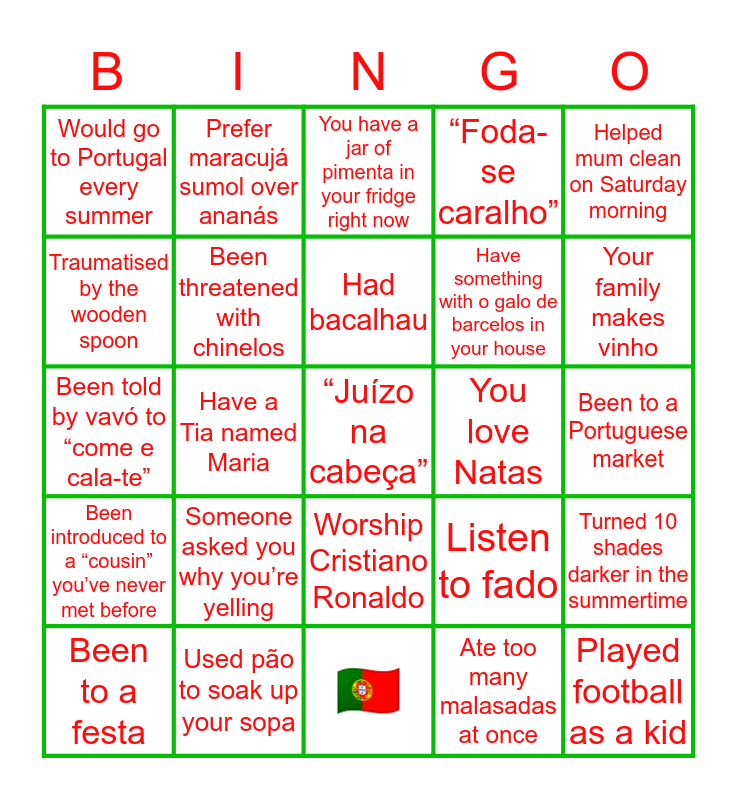 This bingo card has 25 words: Been introduced to a “cousin” you’ve never met before, Used pĂŁo to soak up your sopa, “JuĂzo na cabeça”, Ate too many malasadas at once, Helped mum clean on Saturday morning, Would go to Portugal every summer, Prefer maracujá sumol over ananás, You have a jar of pimenta in your fridge right now, You love Natas, Turned 10 shades darker in the summertime, Traumatised by the wooden spoon, Been threatened with chinelos, 🇵🇹, Listen to fado, Your family makes vinho, Been to a festa, Have a Tia named Maria, Had bacalhau, Have something with o galo de barcelos in your house, Been to a Portuguese market, Been told by vavĂł to “come e cala-te”, Someone asked you why you’re yelling, Worship Cristiano Ronaldo, “Foda-se caralho” and Played football as a kid.
