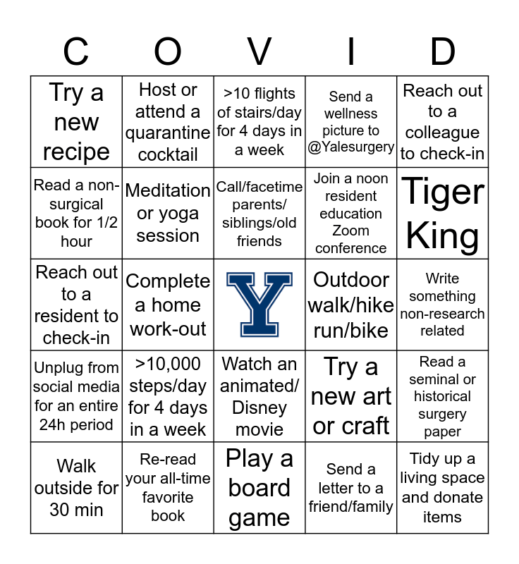This bingo card has a free space and 24 words: >10,000 steps/day for 4 days in a week, Re-read your all-time favorite book, Call/facetime parents/ siblings/old friends, Walk outside for 30 min, Reach out to a colleague to check-in, Try a new recipe, Read a non-surgical book for 1/2 hour, Host or attend a quarantine cocktail, Outdoor walk/hike run/bike, Watch an animated/ Disney movie, Join a noon resident education Zoom conference, Reach out to a resident to check-in, Try a new art or craft, Read a seminal or historical surgery paper, Meditation or yoga session, Send a letter to a friend/family, Write something non-research related, >10 flights of stairs/day for 4 days in a week, Tiger King, Complete a home work-out, Tidy up a living space and donate items, Unplug from social media for an entire 24h period, Send a wellness picture to @Yalesurgery and Play a board game.