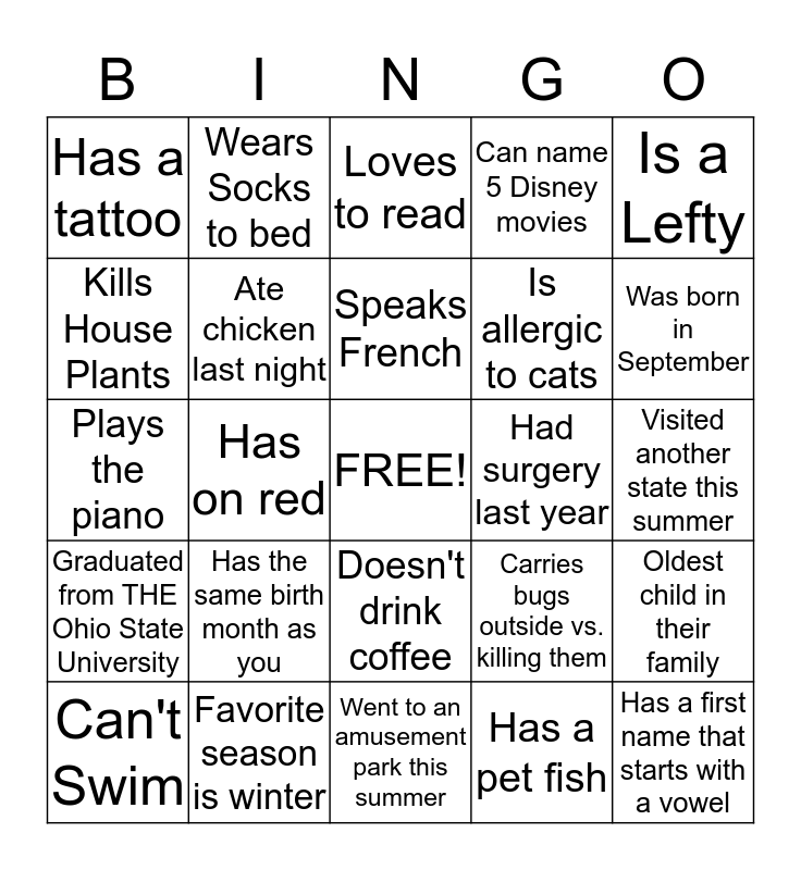 This bingo card has a free space and 24 words: Has the same birth month as you, Favorite season is winter, Speaks French, Can't Swim, Is a Lefty, Has a tattoo, Kills House Plants, Wears Socks to bed, Had surgery last year, Doesn't drink coffee, Is allergic to cats, Plays the piano, Carries bugs outside vs. killing them, Oldest child in their family, Ate chicken last night, Has a pet fish, Visited another state this summer, Loves to read, Was born in September, Has on red, Has a first name that starts with a vowel, Graduated from THE Ohio State University, Can name 5 Disney movies and Went to an amusement park this summer.