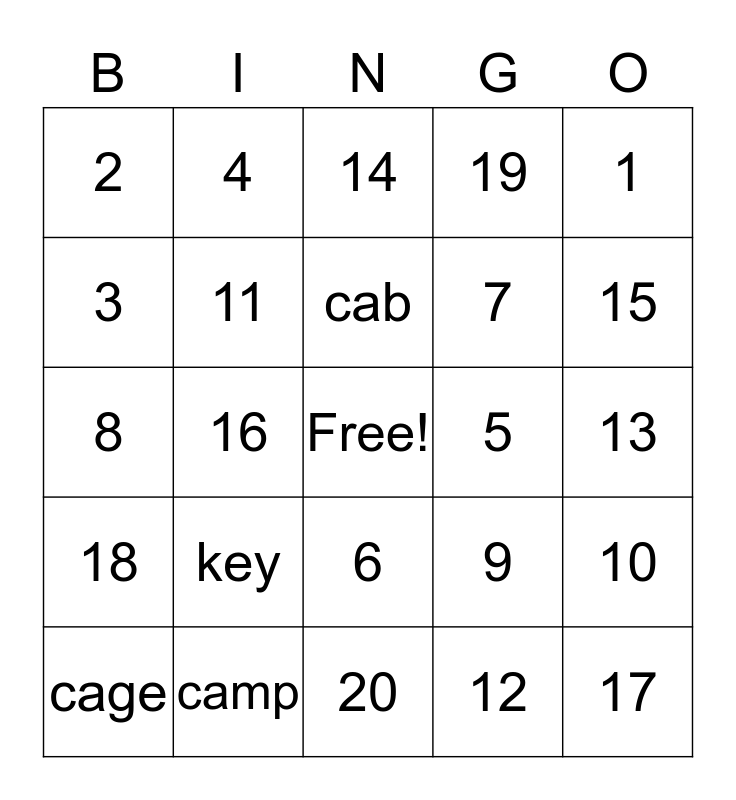 This bingo card has a free space and 24 words: key, camp, cab, cage, 1, 2, 3, 4, 5, 6, 7, 8, 9, 10, 11, 12, 13, 14, 15, 16, 17, 18, 19 and 20.