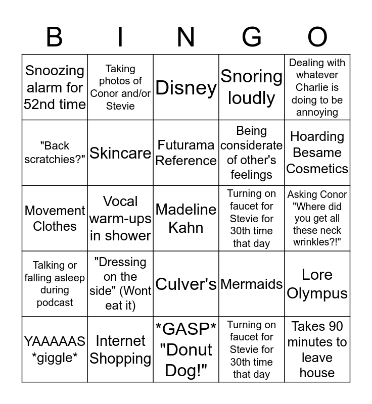This bingo card has a free space and 24 words: "Dressing on the side" (Wont eat it), Internet Shopping, Futurama Reference, YAAAAAS *giggle*, Dealing with whatever Charlie is doing to be annoying, Snoozing alarm for 52nd time, "Back scratchies?", Taking photos of Conor and/or Stevie, Turning on faucet for Stevie for 30th time that day, Culver's, Being considerate of other's feelings, Movement Clothes, Mermaids, Lore Olympus, Skincare, Turning on faucet for Stevie for 30th time that day, Asking Conor "Where did you get all these neck wrinkles?!", Disney, Hoarding Besame Cosmetics, Vocal warm-ups in shower, Takes 90 minutes to leave house, Talking or falling asleep during podcast, Snoring loudly and *GASP* "Donut Dog!".