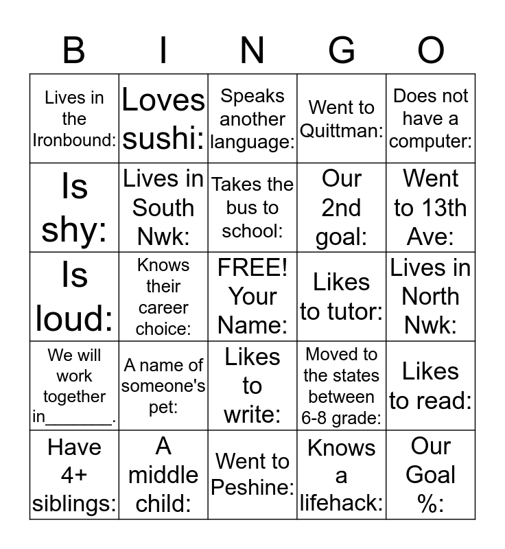 This bingo card has a free space and 24 words: A name of someone's pet:, A middle child:, Takes the bus to school:, Have 4+ siblings:, Does not have a computer:, Lives in the Ironbound:, Is shy:, Loves sushi:, Likes to tutor:, Likes to write:, Our 2nd goal:, Is loud:, Moved to the states between 6-8 grade:, Likes to read:, Lives in South Nwk:, Knows a lifehack:, Lives in North Nwk:, Speaks another language:, Went to 13th Ave:, Knows their career choice:, Our Goal %:, We will work together in_______., Went to Quittman: and Went to Peshine:.