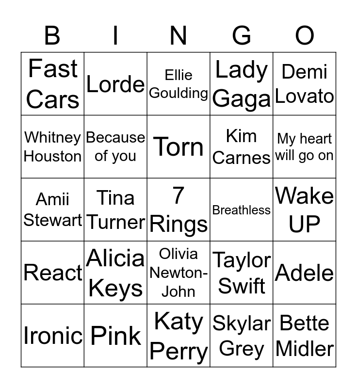 This bingo card has a free space and 24 words: Alicia Keys, Pink, Torn, Ironic, Demi Lovato, Fast Cars, Whitney Houston, Lorde, Breathless, Olivia Newton-John, Kim Carnes, Amii Stewart, Taylor Swift, Adele, Because of you, Skylar Grey, Wake UP, Ellie Goulding, My heart will go on, Tina Turner, Bette Midler, React, Lady Gaga and Katy Perry.