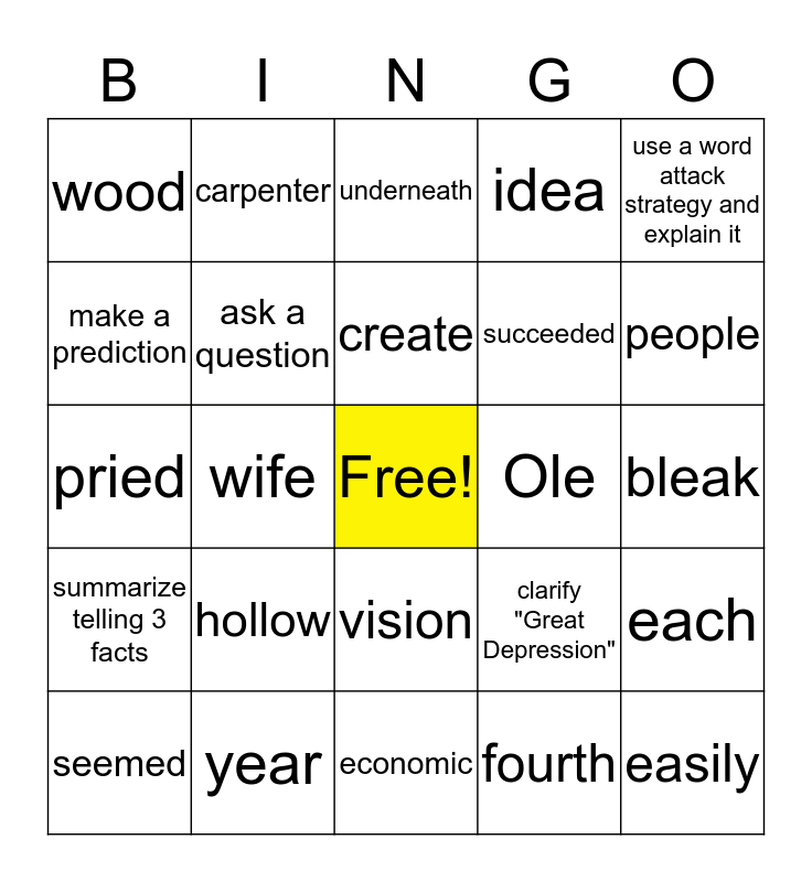 This bingo card has a free space and 24 words: hollow, year, create, seemed, use a word attack strategy and explain it, wood, make a prediction, carpenter, Ole, vision, succeeded, pried, clarify "Great Depression", each, ask a question, fourth, bleak, underneath, people, wife, easily, summarize telling 3 facts, idea and economic.