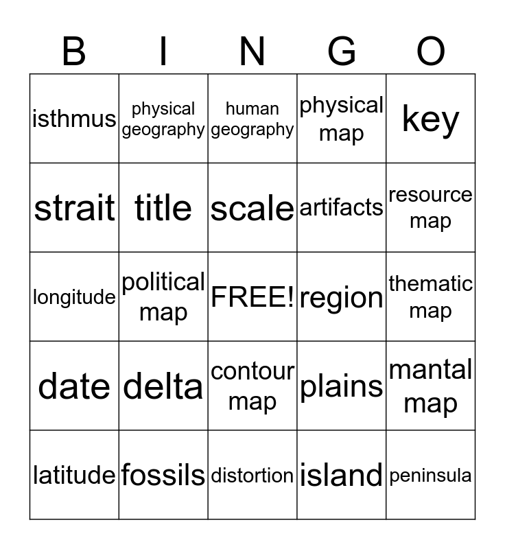 This bingo card has a free space and 24 words: delta, fossils, scale, latitude, key, isthmus, strait, physical geography, region, contour map, artifacts, longitude, plains, mantal map, title, island, thematic map, human geography, resource map, political map, peninsula, date, physical map and distortion.