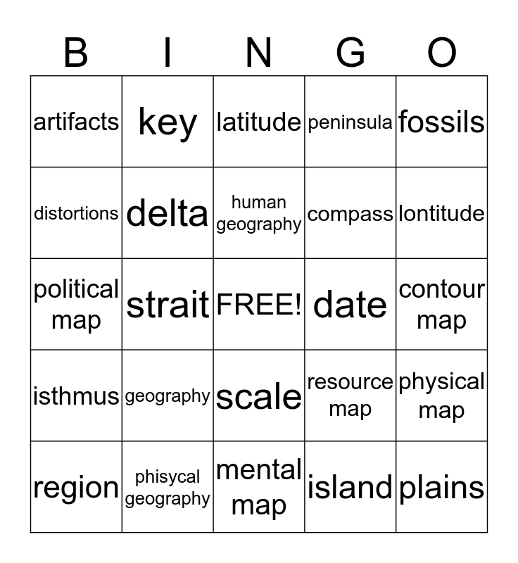 This bingo card has a free space and 24 words: geography, phisycal geography, human geography, region, fossils, artifacts, distortions, key, date, scale, compass, political map, resource map, physical map, delta, island, contour map, latitude, lontitude, strait, plains, isthmus, peninsula and mental map.