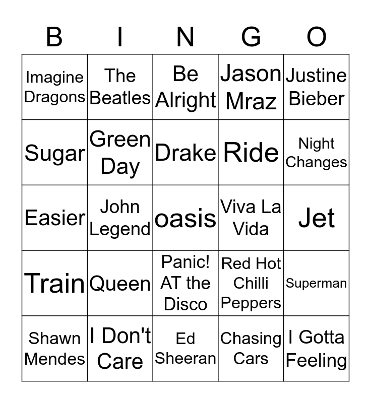 This bingo card has a free space and 24 words: Queen, I Don't Care, Drake, Shawn Mendes, Justine Bieber, Imagine Dragons, Sugar, The Beatles, Viva La Vida, Panic! AT the Disco, Ride, Easier, Red Hot Chilli Peppers, Superman, Green Day, Chasing Cars, Jet, Be Alright, Night Changes, John Legend, I Gotta Feeling, Train, Jason Mraz and Ed Sheeran.