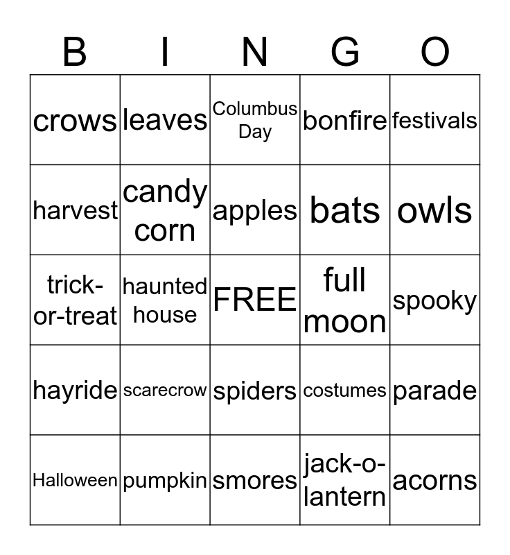 This bingo card has a free space and 24 words: scarecrow, pumpkin, apples, Halloween, festivals, crows, harvest, leaves, full moon, spiders, bats, trick-or-treat, costumes, parade, candy corn, jack-o-lantern, spooky, Columbus Day, owls, haunted house, acorns, hayride, bonfire and smores.