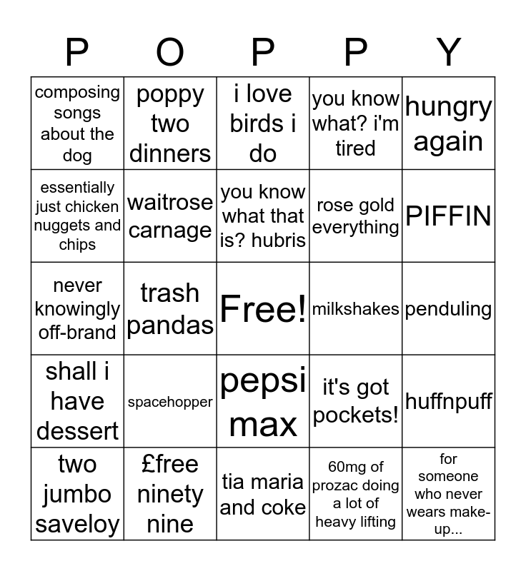 This bingo card has a free space and 24 words: spacehopper, £free ninety nine, you know what that is? hubris, two jumbo saveloy, hungry again, composing songs about the dog, essentially just chicken nuggets and chips, poppy two dinners, milkshakes, pepsi max, rose gold everything, never knowingly off-brand, it's got pockets!, huffnpuff, waitrose carnage, 60mg of prozac doing a lot of heavy lifting, penduling, i love birds i do, PIFFIN, trash pandas, for someone who never wears make-up..., shall i have dessert, you know what? i'm tired and tia maria and coke.