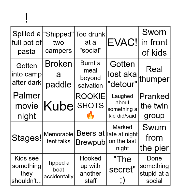 This bingo card has a free space and 24 words: Memorable tent talks, Tipped a boat accidentally, Burnt a meal beyond salvation, Kids see something they shouldn't..., Sworn in front of kids, Spilled a full pot of pasta, Gotten into camp after dark, "Shipped" two campers, Laughed about something a kid did/said, Beers at Brewpub, Gotten lost aka "detour", Palmer movie night, Marked late at night on the last night, Swum from the pier, Broken a paddle, "The secret" ;), Pranked the twin group, Too drunk at a "social", Real thumper, Kube, Done something stupid at a social, Stages!, EVAC! and Hooked up with another staff.