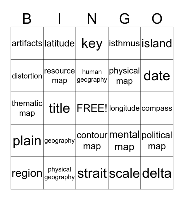 This bingo card has a free space and 24 words: geography, physical geography, human geography, region, island, artifacts, distortion, latitude, longitude, contour map, physical map, thematic map, mental map, political map, resource map, scale, compass, key, date, title, delta, plain, isthmus and strait.