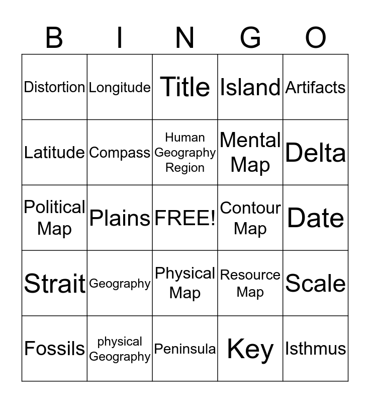 This bingo card has a free space and 24 words: Geography, physical Geography, Human Geography Region, Fossils, Artifacts, Distortion, Latitude, Longitude, Contour Map, Physical Map, Mental Map, Political Map, Resource Map, Scale, Compass, Key, Date, Title, Delta, Plains, Isthmus, Strait, Island and Peninsula.