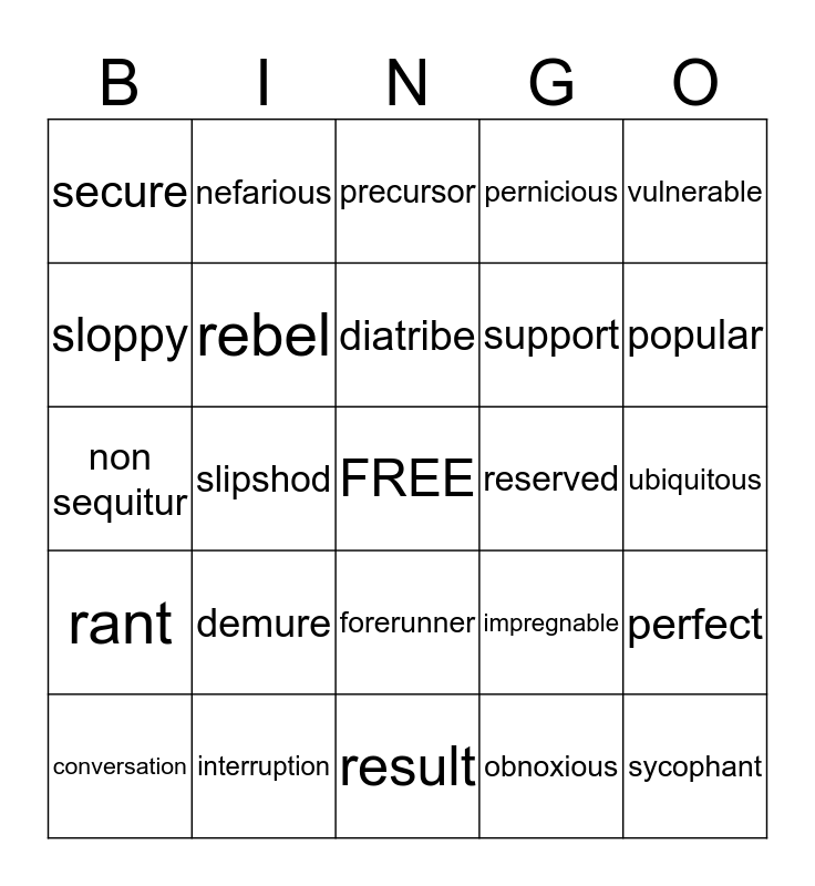 This bingo card has a free space and 24 words: demure, interruption, diatribe, conversation, vulnerable, secure, sloppy, nefarious, reserved, forerunner, support, non sequitur, impregnable, perfect, rebel, obnoxious, ubiquitous, precursor, popular, slipshod, sycophant, rant, pernicious and result.