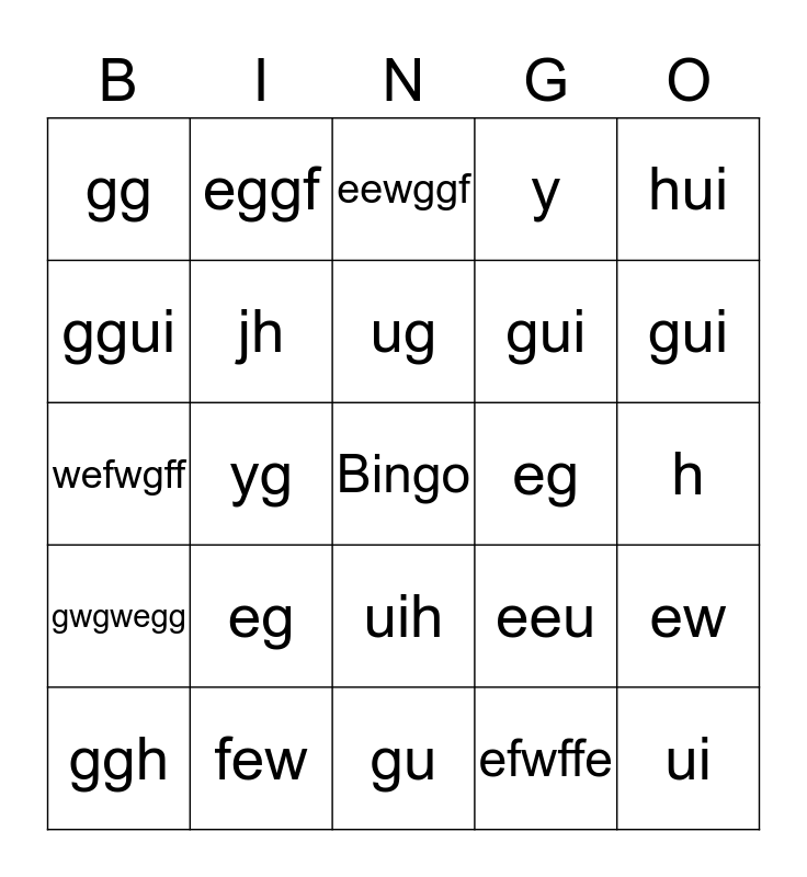 This bingo card has a free space and 39 words: hggg, kj, wwgegwek, jh, ggh, uih, ug, hui, hui, gwgwegg, yg, y, ui, h, eg, eg, gu, gg, w3g, eeu, ggui, gu, gui, gui, weffwe, fewf, fe, effe, f, eggf, ewf, fee, eewggf, few, efwffe, wef, ew, wefwgff and gew.