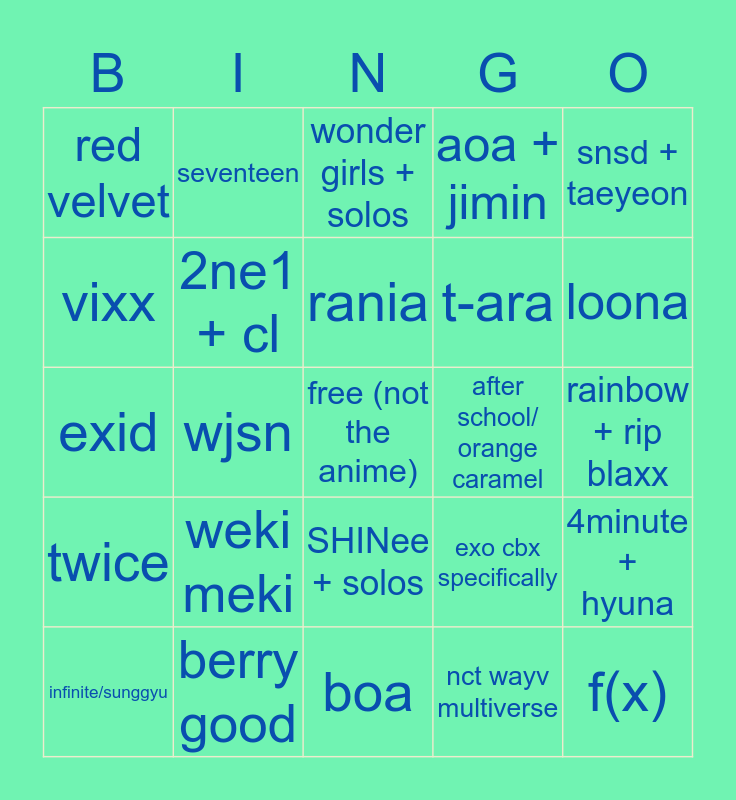 This bingo card has a free space and 24 words: weki meki, berry good, rania, infinite/sunggyu, snsd + taeyeon, red velvet, vixx, seventeen, after school/ orange caramel, SHINee + solos, t-ara, exid, exo cbx specifically, 4minute + hyuna, 2ne1 + cl, nct wayv multiverse, rainbow + rip blaxx, wonder girls + solos, loona, wjsn, f(x), twice, aoa + jimin and boa.