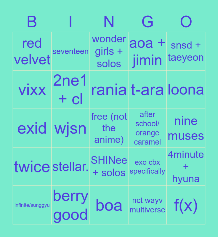 This bingo card has a free space and 24 words: stellar., berry good, rania, infinite/sunggyu, snsd + taeyeon, red velvet, vixx, seventeen, after school/ orange caramel, SHINee + solos, t-ara, exid, exo cbx specifically, 4minute + hyuna, 2ne1 + cl, nct wayv multiverse, nine muses, wonder girls + solos, loona, wjsn, f(x), twice, aoa + jimin and boa.