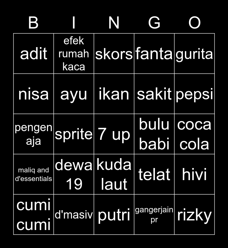 This bingo card has a free space and 24 words: dewa 19, d'masiv, ikan, cumi cumi, gurita, adit, nisa, efek rumah kaca, bulu babi, kuda laut, sakit, pengen aja, telat, hivi, ayu, gangerjain pr, coca cola, skors, pepsi, sprite, rizky, maliq and d'essentials, fanta and putri.
