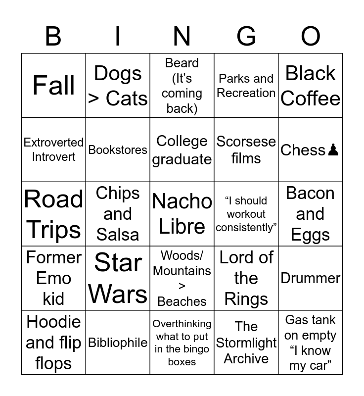 This bingo card has 25 words: Star Wars, Overthinking what to put in the bingo boxes, College graduate, Hoodie and flip flops, Black Coffee, Fall, Extroverted Introvert, Dogs > Cats, “I should workout consistently”, Woods/ Mountains > Beaches, Scorsese films, Road Trips, Lord of the Rings, Drummer, Bookstores, Gas tank on empty “I know my car”, Bacon and Eggs, Beard (It’s coming back), Chess♟, Chips and Salsa, Nacho Libre, Bibliophile, Former Emo kid, Parks and Recreation and The Stormlight Archive.
