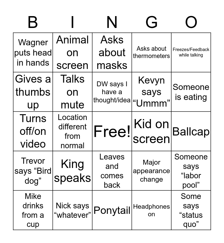 This bingo card has a free space and 25 words: King speaks, Ponytail, DW says I have a thought/idea, Mike drinks from a cup, Freezes/Feedback while talking, Wagner puts head in hands, Gives a thumbs up, Animal on screen, Kid on screen, Leaves and comes back, Kevyn says “Ummm”, Turns off/on video, Major appearance change, Someone says “labor pool”, Talks on mute, Takes another call, Ballcap, Asks about masks, Someone is eating, Location different from normal, Some says “status quo”, Nick says “whatever”, Trevor says “Bird dog”, Asks about thermometers and Headphones on.