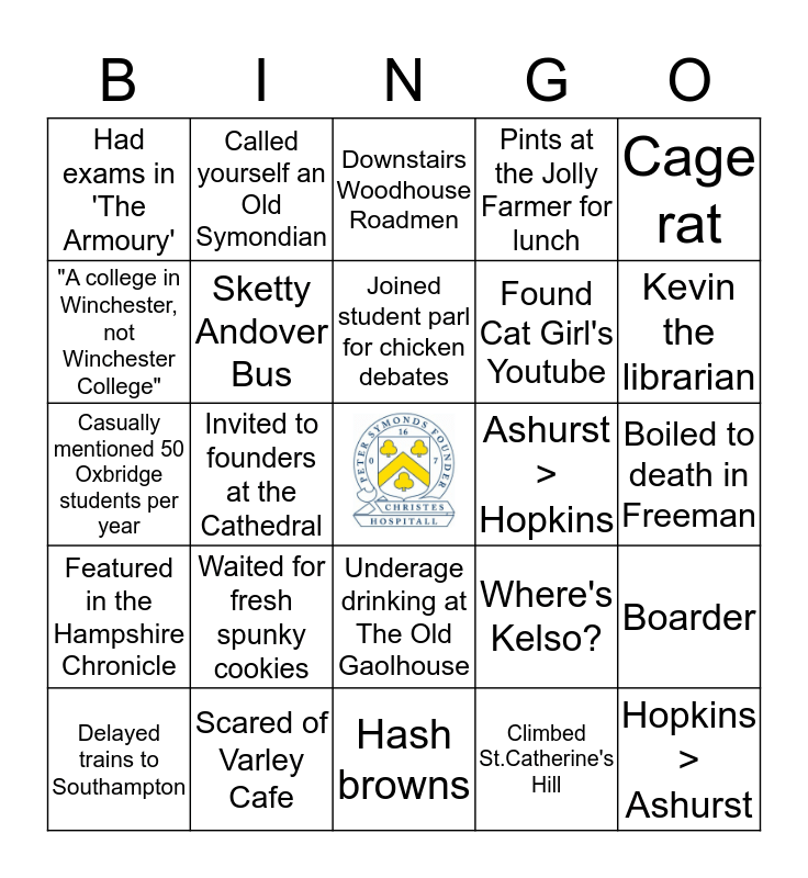 This bingo card has a free space and 24 words: Waited for fresh spunky cookies, Scared of Varley Cafe, Joined student parl for chicken debates, Delayed trains to Southampton, Cage rat, Had exams in 'The Armoury', "A college in Winchester, not Winchester College", Called yourself an Old Symondian, Ashurst > Hopkins, Underage drinking at The Old Gaolhouse, Found Cat Girl's Youtube, Casually mentioned 50 Oxbridge students per year, Where's Kelso?, Boarder, Sketty Andover Bus, Climbed St.Catherine's Hill, Boiled to death in Freeman, Downstairs Woodhouse Roadmen, Kevin the librarian, Invited to founders at the Cathedral, Hopkins > Ashurst, Featured in the Hampshire Chronicle, Pints at the Jolly Farmer for lunch and Hash browns.