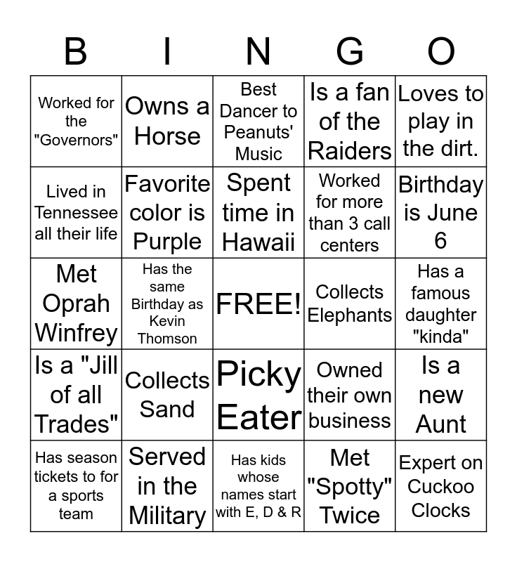 This bingo card has a free space and 24 words: Collects Sand, Served in the Military, Spent time in Hawaii, Has season tickets to for a sports team, Loves to play in the dirt., Worked for the "Governors", Lived in Tennessee all their life, Owns a Horse, Collects Elephants, Picky Eater, Worked for more than 3 call centers, Met Oprah Winfrey, Owned their own business, Is a new Aunt, Favorite color is Purple, Met "Spotty" Twice, Has a famous daughter "kinda", Best Dancer to Peanuts' Music, Birthday is June 6, Has the same Birthday as Kevin Thomson, Expert on Cuckoo Clocks, Is a "Jill of all Trades", Is a fan of the Raiders and Has kids whose names start with E, D & R.