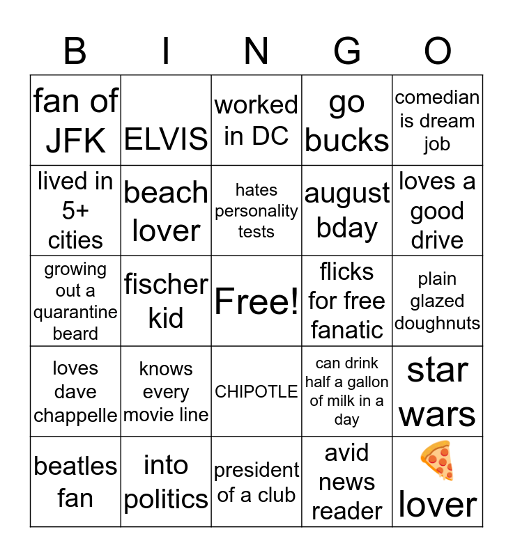 This bingo card has a free space and 24 words: knows every movie line, into politics, hates personality tests, beatles fan, comedian is dream job, fan of JFK, lived in 5+ cities, ELVIS, flicks for free fanatic, CHIPOTLE, august bday, growing out a quarantine beard, can drink half a gallon of milk in a day, star wars, beach lover, avid news reader, plain glazed doughnuts, worked in DC, loves a good drive, fischer kid, 🍕 lover, loves dave chappelle, go bucks and president of a club.