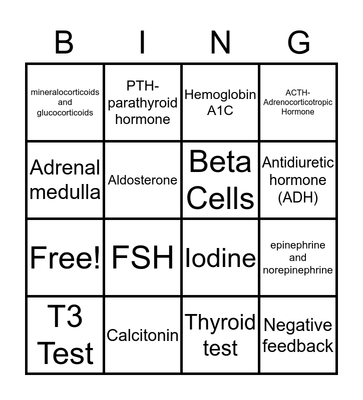 This bingo card has 16 words: T3 Test, Calcitonin, Hemoglobin A1C, ACTH- Adrenocorticotropic Hormone, Adrenal medulla, PTH-parathyroid hormone, Iodine, epinephrine and norepinephrine, mineralocorticoids and glucocorticoids, Aldosterone, Thyroid test, Antidiuretic hormone (ADH), Free!, FSH, Beta Cells and Negative feedback.