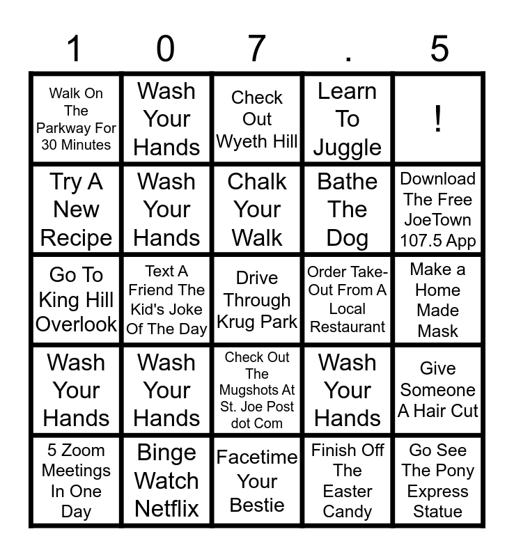 This bingo card has a free space and 24 words: Wash Your Hands, Binge Watch Netflix, Chalk Your Walk, 5 Zoom Meetings In One Day, !, Walk On The Parkway For 30 Minutes, Try A New Recipe, Wash Your Hands, Order Take-Out From A Local Restaurant, Check Out The Mugshots At St. Joe Post dot Com, Bathe The Dog, Go To King Hill Overlook, Wash Your Hands, Give Someone A Hair Cut, Wash Your Hands, Finish Off The Easter Candy, Make a Home Made Mask, Check Out Wyeth Hill, Download The Free JoeTown 107.5 App, Text A Friend The Kid's Joke Of The Day, Go See The Pony Express Statue, Wash Your Hands, Learn To Juggle and Facetime Your Bestie.