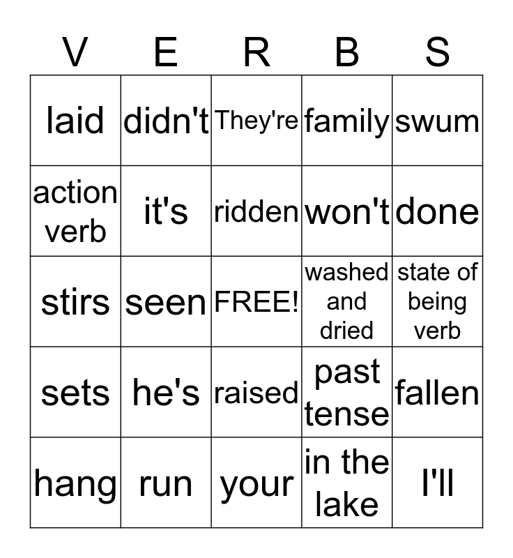 This bingo card has a free space and 24 words: he's, run, ridden, hang, swum, laid, action verb, didn't, washed and dried, raised, won't, stirs, past tense, fallen, it's, in the lake, state of being verb, They're, done, seen, I'll, sets, family and your.