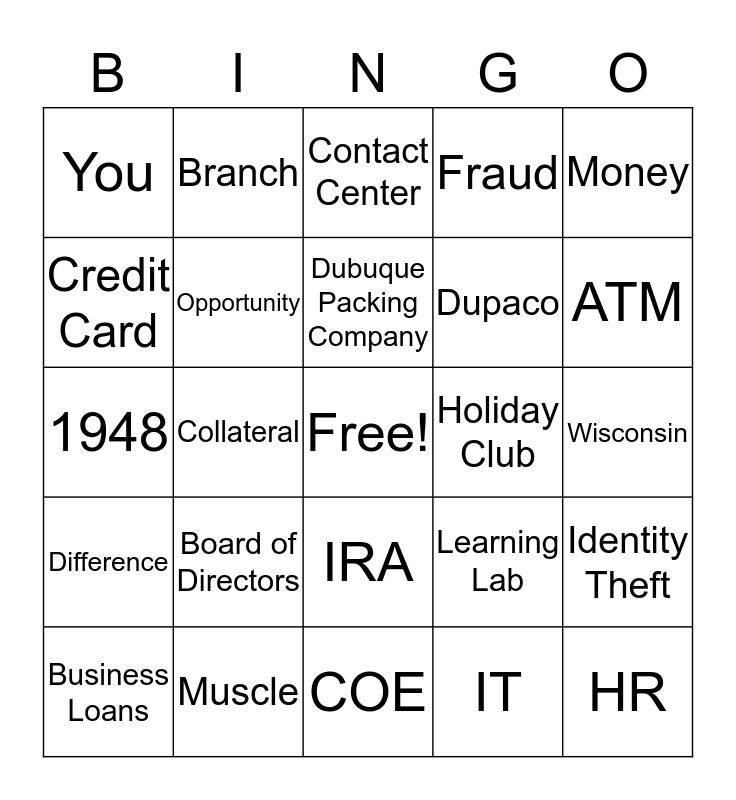 This bingo card has a free space and 101 words: Deposit, Online Banking, Money, Debit Card, Withdrawal, Balance, Interest, Safety Deposit Box, Mobile Deposit, Personal Loan, Auto Loan, Mortgage, Student Loan, Consolidate, Refinance, Community, Difference, HELOC, Direct Deposit, Savings Account, You Name it savings, Vault, Teller, Check, Overdraft Protection, ATM, Fraud, Board of Directors, The Burst, Deposit Operations, Branch, Contact Center, Marketing, Members, Training, IRA, Live Video Teller, Member Solutions, IT, COE, Project Management, Business Loans, DIS, DFS, Help Desk, HR, MSR, SEG, Thank Use, Employee Wellness, Transfer, Credit Card, Rate, Cooperative, Bright Track, Credit Score, R.W. Hoefer Foundation, Money Makeover, Fresh Start, Cross sales, Opportunity, Referral, Care, Account, Value, Dupaco, Debt, Collateral, Muscle, Drive Up, Voices, Volunteer, You, $25, Dubuque Packing Company, 1948, Member Experience, Dupaco Experience, On boarding, Benefits, Money Order, Cashier Check, Holiday Club, DoPack, Iowa, Illinois, Wisconsin, EStatement, ENotifier, EAlert, Learning Lab, Launch Pad Savings, Great Credit Race, Changeup Savings, CD, Identity Theft, Department, Branch, Systematic Savings, Bill Pay and Invest.