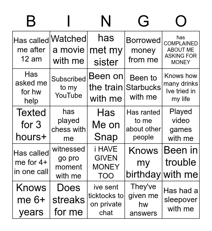 This bingo card has a free space and 24 words: witnessed go pro moment with me, Does streaks for me, Been on the train with me, Knows me 6+ years, has COMPLAINED ABOUT ME ASKING FOR MONEY, Has called me after 12 am, Has asked me for hw help, Watched a movie with me, Has ranted to me about other people, i HAVE GIVEN MONEY TOO, Been to Starbucks with me, Texted for 3 hours+, Knows my birthday, Been in trouble with me, Subscribed to my YouTube, They've given me hw answers, Played video games with me, has met my sister, Knows how many drinks Ive tried in my life, has played chess with me, Has had a sleepover with me, Has called me for 4+ in one call, Borrowed money from me and ive sent ticktocks to on private chat.