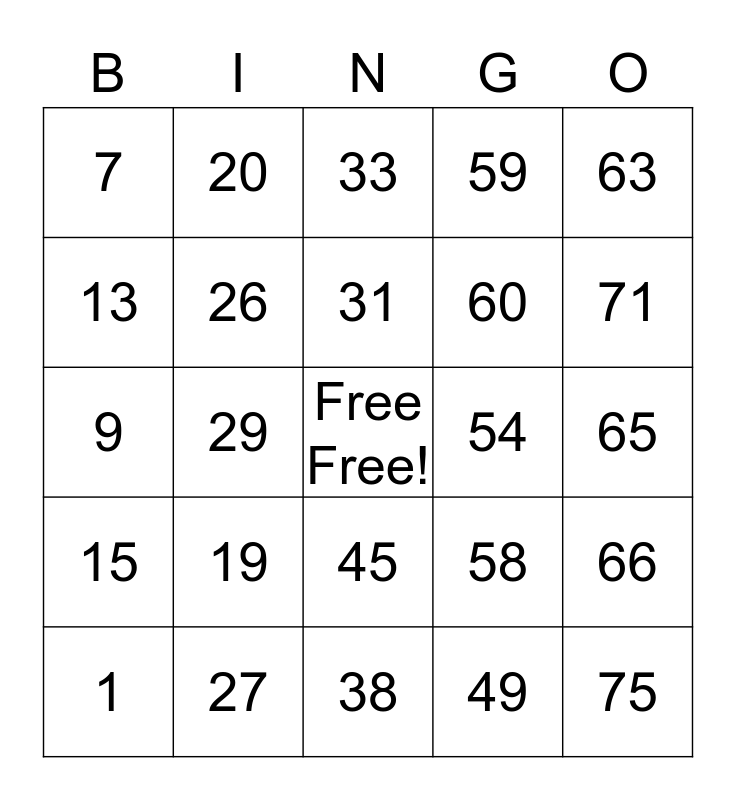 This bingo card has a free space and 24 words: 1, 19, 31, 49, 63, 7, 20, 33, 54, 65, 9, 26, 58, 66, 13, 27, 38, 59, 71, 15, 29, 45, 60 and 75.