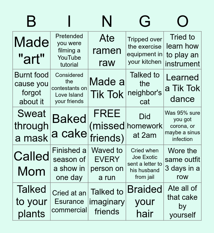 This bingo card has a free space and 24 words: Finished a season of a show in one day, Cried at an Esurance commercial, Made a Tik Tok, Talked to your plants, Tried to learn how to play an instrument, Made "art", Burnt food cause you forgot about it, Pretended you were filming a YouTube tutorial, Did homework at 2am, Waved to EVERY person on a run, Talked to the neighbor's cat, Sweat through a mask, Cried when Joe Exotic sent a letter to his husband from jail, Wore the same outfit 3 days in a row, Considered the contestants on Love Island your friends, Braided your hair, Was 95% sure you got corona, or maybe a sinus infection, Ate ramen raw, Learned a Tik Tok dance, Baked a cake, Ate all of that cake by yourself, Called Mom, Tripped over the exercise equipment in your kitchen and Talked to imaginary friends.