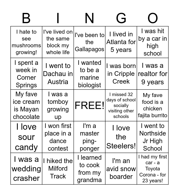 This bingo card has a free space and 24 words: I won first place in a dance contest, I hiked the Milford Track, I wanted to be a marine biologist, I was a wedding crasher, I was hit by a car in high school, I hate to see mushrooms growing!, I spent a week in Corner Springs, I've lived on the same block my whole life, I missed 32 days of school socially visiting other schools, I'm a master ping-ponger, I was born in Cripple Creek, My fave ice cream is Mayan chocolate, I love the Steelers!, I went to Northside Jr High School, I went to Dachau in Austria, I'm an avid snow boarder, My fave food is a chicken fajita burrito, I've been to the Gallapagos, I was a realtor for 9 years, I was a tomboy growing up, I had my first car - a Toyota Corona - for 23 years!, I love sour candy, I lived in Atlanta for 5 years and I learned to cook from my grandma.