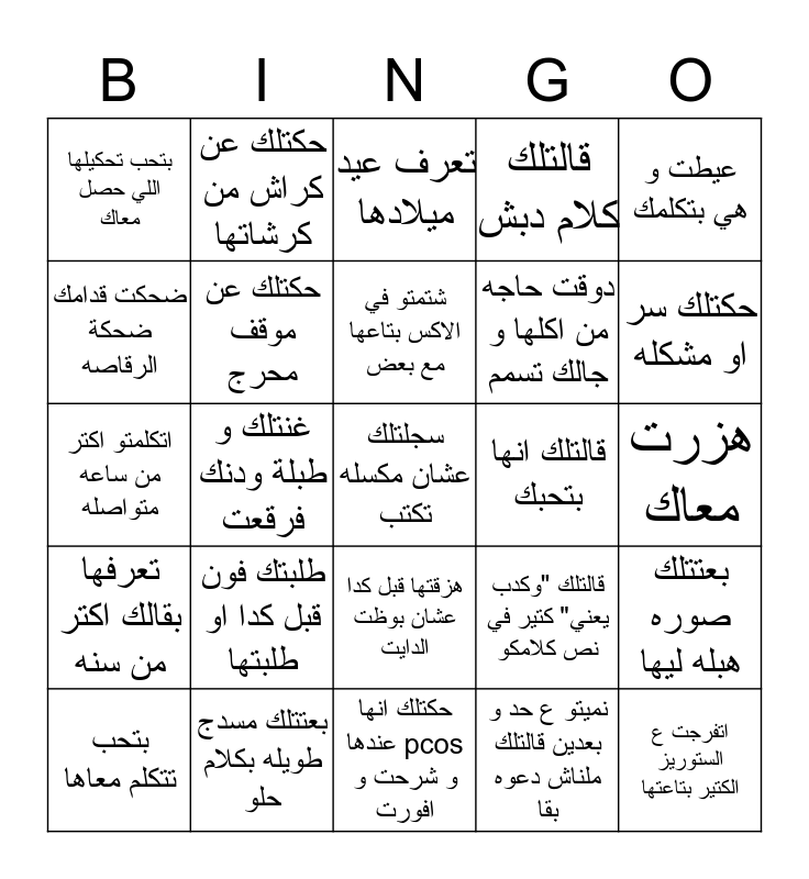 This bingo card has 25 words: تعرفها بقالك اكتر من سنه, بعتتلك مسدج طويله بكلام حلو, سجلتلك عشان مكسله تكتب, نميتو ع حد و بعدين قالتلك ملناش دعوه بقا, عيطت و هي بتكلمك, بتحب تحكيلها اللي حصل معاك, حكتلك عن كراش من كرشاتها, تعرف عيد ميلادها, قالتلك انها بتحبك, بعتتلك صوره هبله ليها, ضحكت قدامك ضحكة الرقاصه, حكتلك عن موقف محرج, حكتلك انها عندها pcos و شرحت و افورت, قالتلك "وكدب يعني" كتير في نص كلامكو, حكتلك سر او مشكله, بتحب تتكلم معاها, غنتلك و طبلة ودنك فرقعت, شتمتو في الاكس بتاعها مع بعض, دوقت حاجه من اكلها و جالك تسمم, هزرت معاك, اتكلمتو اكتر من ساعه متواصله, طلبتك فون قبل كدا او طلبتها, هزقتها قبل كدا عشان بوظت الدايت, قالتلك كلام دبش and اتفرجت ع الستوريز الكتير بتاعتها.
