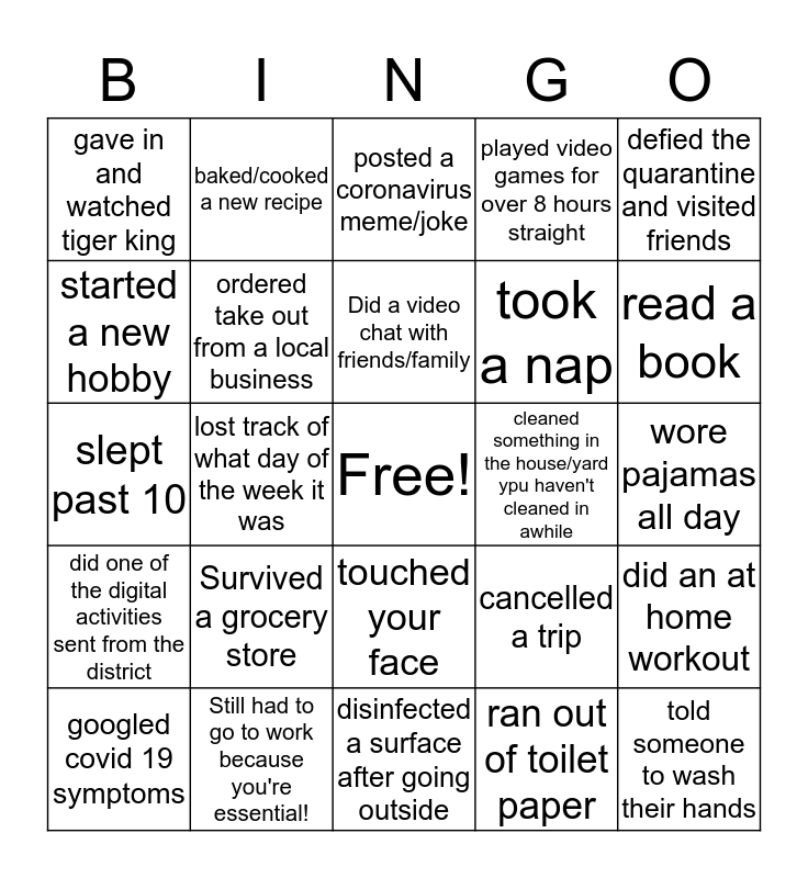 Coronavirus Bingo | Bored in a house bingo | Survivedk because you're essential! Did a video chat with friends/family googled covid 19 symptoms defied the quarantine and visited friends gave in and watched tiger king started a new hobby baked/cooked a new rec | ~*Back from Spring Break BINGO!*~ | Spring Break - Peer Bingo