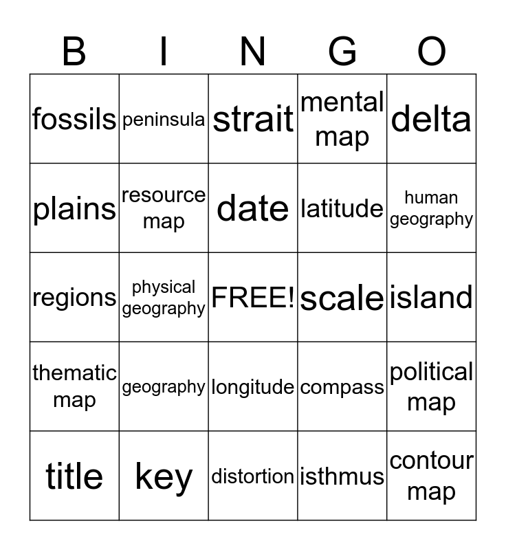 This bingo card has a free space and 24 words: geography, key, date, title, delta, fossils, plains, peninsula, scale, longitude, latitude, regions, compass, political map, resource map, isthmus, island, strait, human geography, physical geography, contour map, thematic map, mental map and distortion.