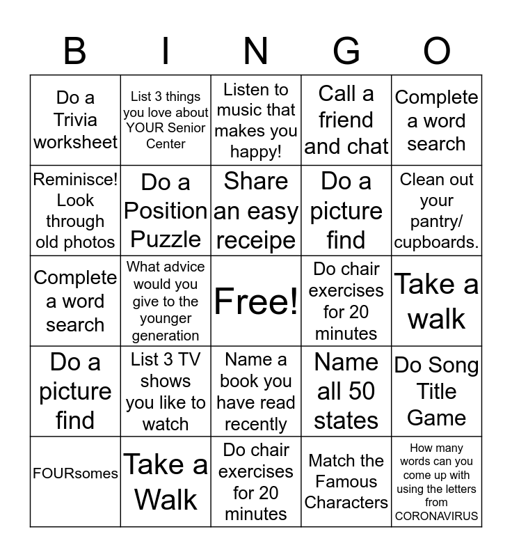 This bingo card has a free space and 24 words: List 3 TV shows you like to watch, Take a Walk, Share an easy receipe, FOURsomes, Complete a word search, Do a Trivia worksheet, Reminisce! Look through old photos, List 3 things you love about YOUR Senior Center, Do chair exercises for 20 minutes, Name a book you have read recently, Do a picture find, Complete a word search, Name all 50 states, Do Song Title Game, Do a Position Puzzle, Match the Famous Characters, Take a walk, Listen to music that makes you happy!, Clean out your pantry/ cupboards., What advice would you give to the younger generation, How many words can you come up with using the letters from CORONAVIRUS, Do a picture find, Call a friend and chat and Do chair exercises for 20 minutes.