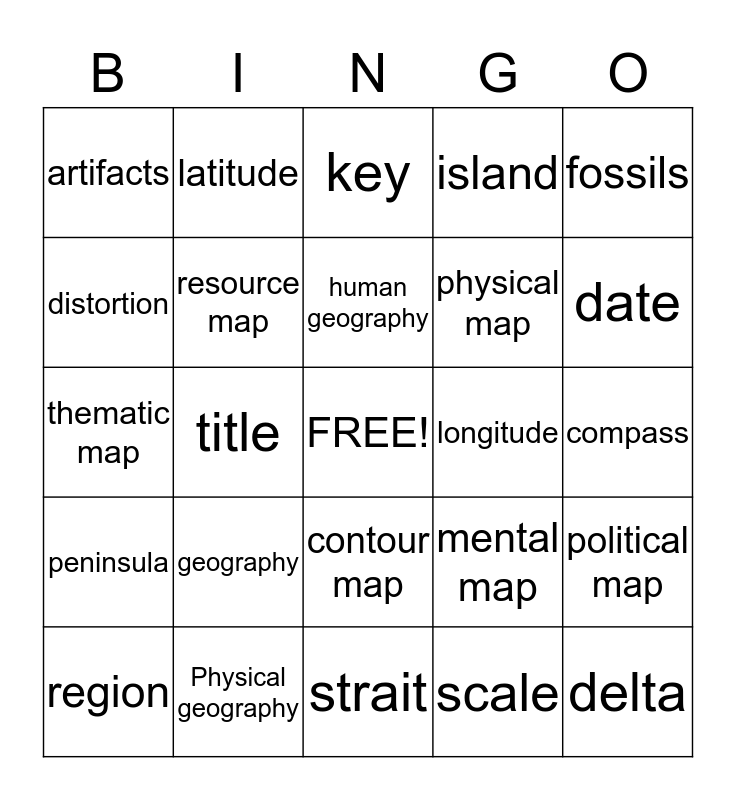 This bingo card has a free space and 24 words: geography, Physical geography, human geography, region, fossils, artifacts, distortion, latitude, longitude, contour map, physical map, thematic map, mental map, political map, resource map, scale, compass, key, date, title, delta, peninsula, island and strait.