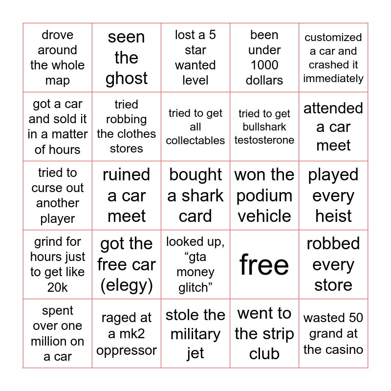 This bingo card has 25 words: got the free car (elegy), stole the military jet, tried to get all collectables, spent over one million on a car, customized a car and crashed it immediately, drove around the whole map, got a car and sold it in a matter of hours, seen the ghost, won the podium vehicle, looked up, “gta money glitch”, tried to get bullshark testosterone, tried to curse out another player, free, robbed every store, tried robbing the clothes stores, wasted 50 grand at the casino, played every heist, lost a 5 star wanted level, attended a car meet, ruined a car meet, bought a shark card, raged at a mk2 oppressor, grind for hours just to get like 20k, been under 1000 dollars and went to the strip club.