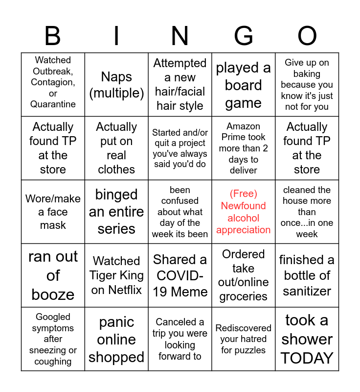 This bingo card has a free space and 24 words: Googled symptoms after sneezing or coughing, Watched Tiger King on Netflix, Started and/or quit a project you've always said you'd do, Rediscovered your hatred for puzzles, Give up on baking because you know it's just not for you, Watched Outbreak, Contagion, or Quarantine, Naps (multiple), Attempted a new hair/facial hair style, (Free) Newfound alcohol appreciation, cleaned the house more than once...in one week, Wore/make a face mask, Actually put on real clothes, Ordered take out/online groceries, finished a bottle of sanitizer, Actually found TP at the store, panic online shopped, Canceled a trip you were looking forward to, played a board game, Actually found TP at the store, ran out of booze, binged an entire series, Shared a COVID-19 Meme, Amazon Prime took more than 2 days to deliver and took a shower TODAY.