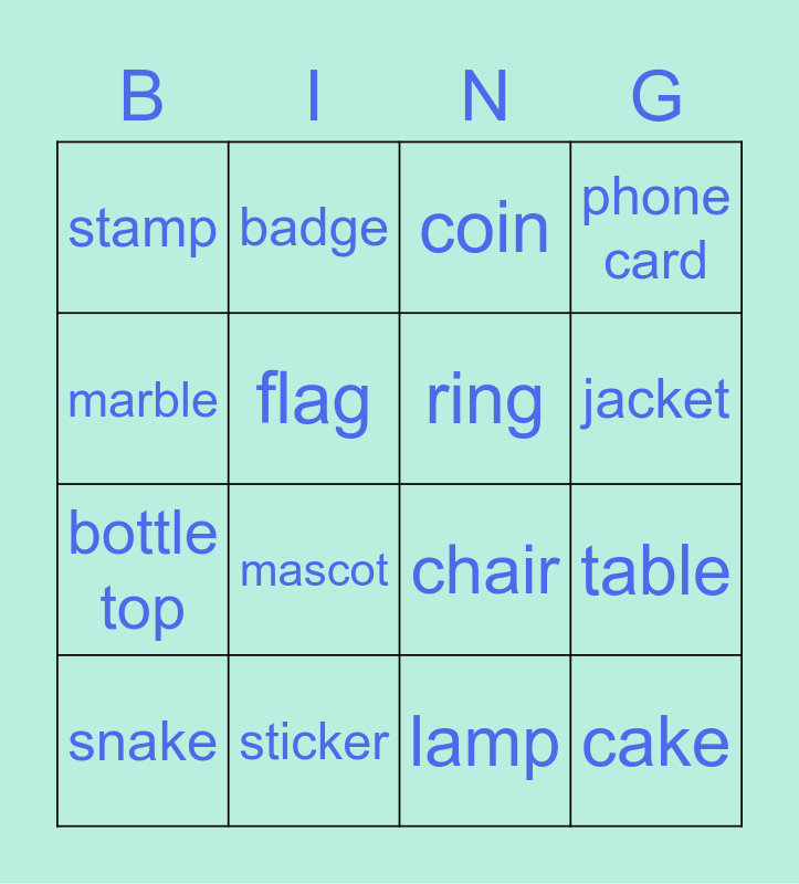 This bingo card has 16 words: sticker, table, coin, stamp, bottle top, badge, chair, lamp, marble, flag, snake, phone card, mascot, jacket, ring and cake.