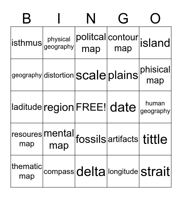 This bingo card has a free space and 24 words: mental map, compass, scale, thematic map, island, isthmus, geography, physical geography, date, fossils, plains, laditude, artifacts, tittle, distortion, longitude, human geography, politcal map, phisical map, region, strait, resoures map, contour map and delta.