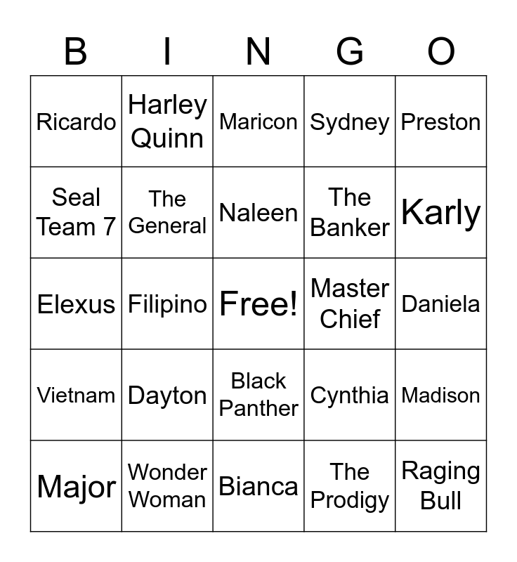 This bingo card has a free space and 60 words: World of Warcraft, Wonder Woman, Wolverine, Vietnam, The Prodigy, The Philippines, The General, The Don, The Banker, Talia, Sydney, Shiba Inu, Seal Team 7, Sandra, Ryan, Ricardo, Raging Bull, Preston, Paulina, Naleen, Master Chief, Maricon, Major, Madison, Madeline, Korea, Keylan, Katelyn, Karly, Jordan, Jon, Japan, Jamaica, Indonesia, Harley Quinn, Garison, Fruits Basket, Filipino, Elijah, Elexus, Dynamite, Dayton, Daniela, Daniel, Cynthia, Corgi, Carnell, Carnage, Bryan, Black Panther, Bianca, Beast Mode, Aventador, Athena, Anubis, Annie, Angie, Alan, 12 and 3.