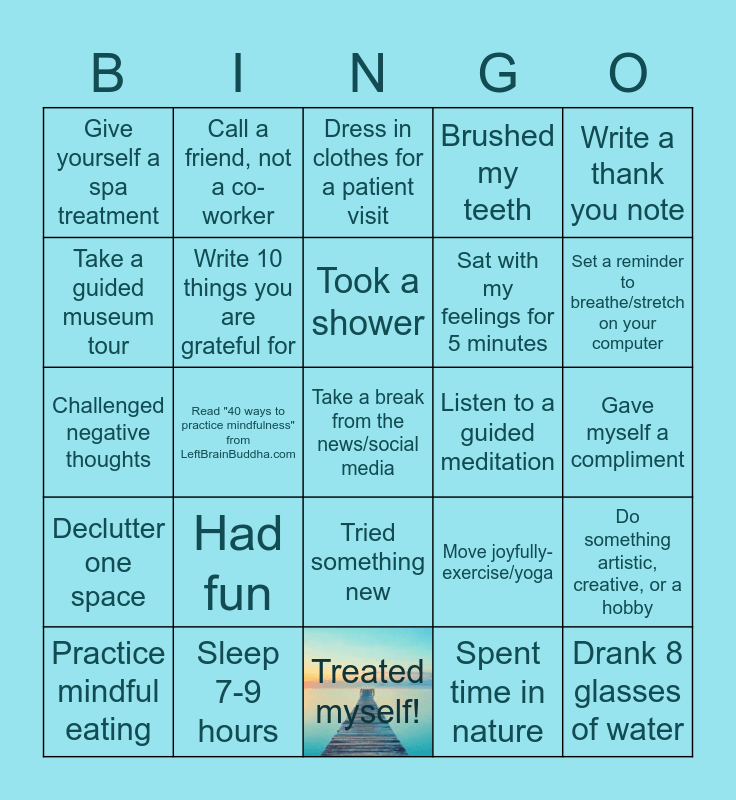 This bingo card has 1 images and 25 words: Declutter one space, Sleep 7-9 hours, Take a break from the news/social media, Spent time in nature, Write a thank you note, Give yourself a spa treatment, Call a friend, not a co-worker, Dress in clothes for a patient visit, Listen to a guided meditation, Do something artistic, creative, or a hobby, Take a guided museum tour, Write 10 things you are grateful for, Treated myself!, Move joyfully-exercise/yoga, Set a reminder to breathe/stretch on your computer, Practice mindful eating, Read "40 ways to practice mindfulness" from LeftBrainBuddha.com, Took a shower, Sat with my feelings for 5 minutes, Gave myself a compliment, Challenged negative thoughts, Had fun, Tried something new, Brushed my teeth and Drank 8 glasses of water.
