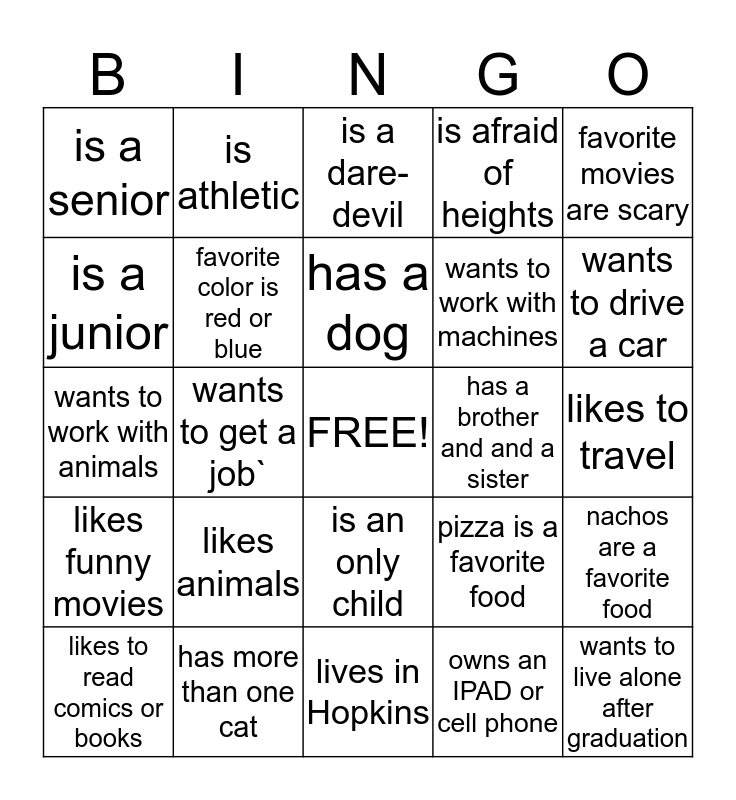 This bingo card has a free space and 24 words: likes animals, has more than one cat, has a dog, likes to read comics or books, favorite movies are scary, is a senior, is a junior, is athletic, has a brother and and a sister, is an only child, wants to work with machines, wants to work with animals, pizza is a favorite food, nachos are a favorite food, favorite color is red or blue, owns an IPAD or cell phone, likes to travel, is a dare-devil, wants to drive a car, wants to get a job`, wants to live alone after graduation, likes funny movies, is afraid of heights and lives in Hopkins.